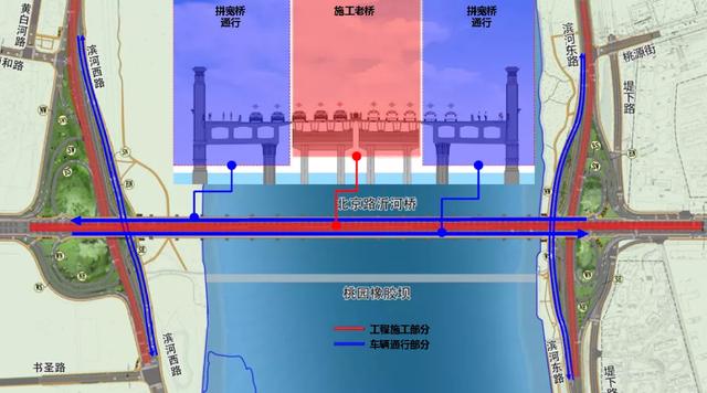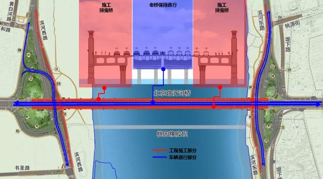 工程的交通疏导方案显示,整个工程将分两个阶段进行。第一阶段,利用现状老桥及滨河东、西路保持主线东西向及南北向通行,车辆转向通过现状匝道实现。同时施工老桥两侧拼宽桥梁及部分匝道。第二阶段,两侧新桥建成后,车辆走新桥,利用新桥、匝道及临时便道保证主线东西向及南北向通行,车辆转向通过新建匝道实现;再进行老桥顶升及改造。最后全线建成通车,形成一个完整的新大桥及两岸立交,实现交通枢纽功能。
