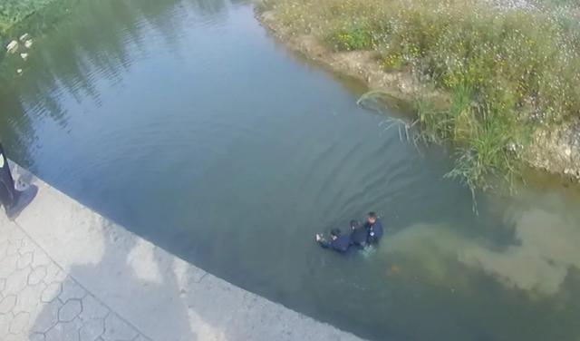 民警徐金宝和辅警徐熙强毫不犹豫地下了水,水底下的淤泥让他们行进十分困难,每走一步脚就深深陷进淤泥里。靠近男孩后,两人合力把男孩拖上了岸。