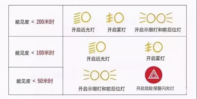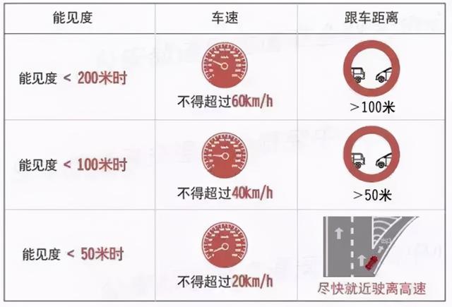 当能见度在50米以下时,已进入高速公路的车辆,驾驶员必须按规定开启雾灯和防眩目近光灯、示宽灯和尾灯,在保证安全的原则下驶离雾区,时速不得超过20公里。