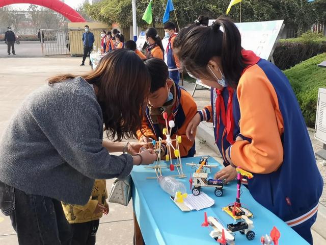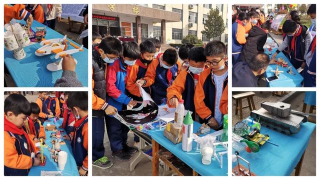 一次性纸杯,塑料饮品瓶,纸盒,木板等物品在学生们的手中全都变废为宝,装上电池通上电,变成小飞机,机器人,升降旗杆等。一件件有趣又不简单的小制作,是学生们动脑思考,科学探究的结晶。