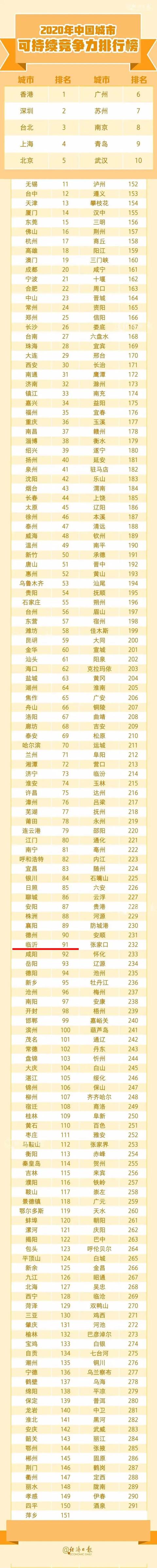 291个城市中,临沂在城市可持续竞争力排名第91名。