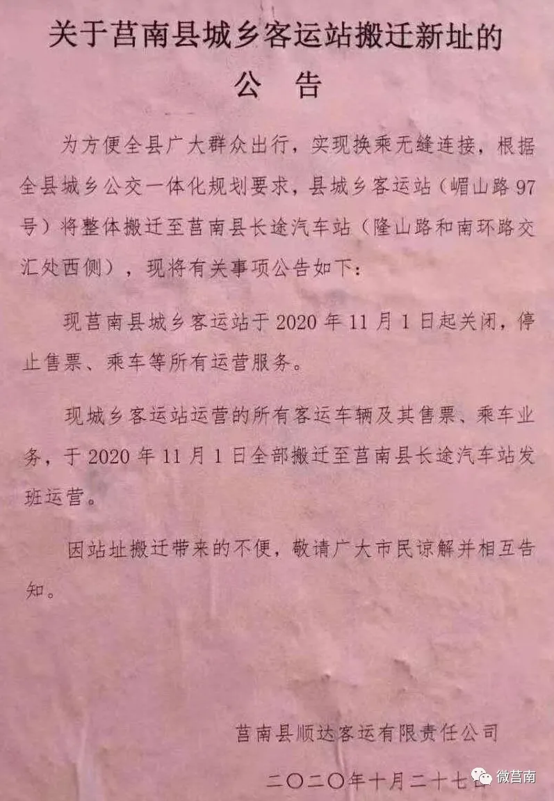 27日,顺达客运公司发布公告,县城乡客运站将整体搬迁至莒南县长途汽车站。11月1日起关闭,停止所有运营服务。