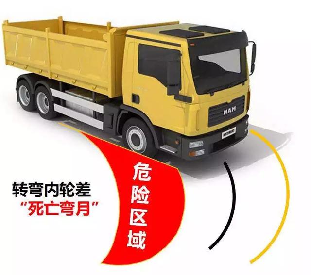 大货车在右转弯过程中,司机会有一个视线死角,如果此时有人、车在旁边,很容易发生车祸致死,这一死角即内轮差,人们形象地称为“死亡弯月”。