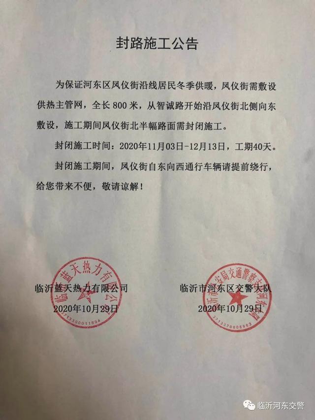 为保证河东区凤仪街沿线居民冬季供暖,凤仪街需敷设供热主管网,全长800米,从智诚路开始沿凤仪街北侧向东敷设,施工期间凤仪街北半幅路面需封闭施工。