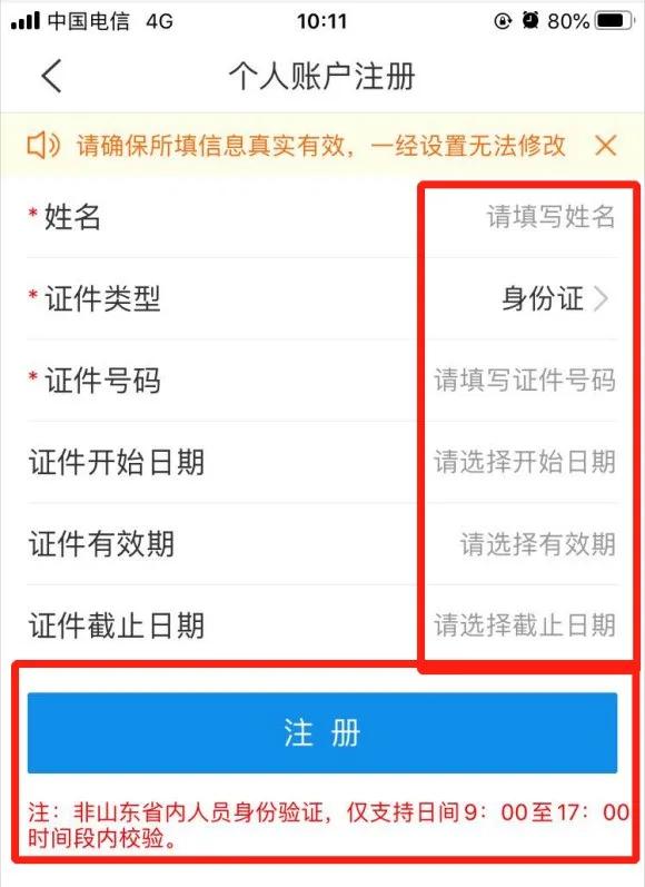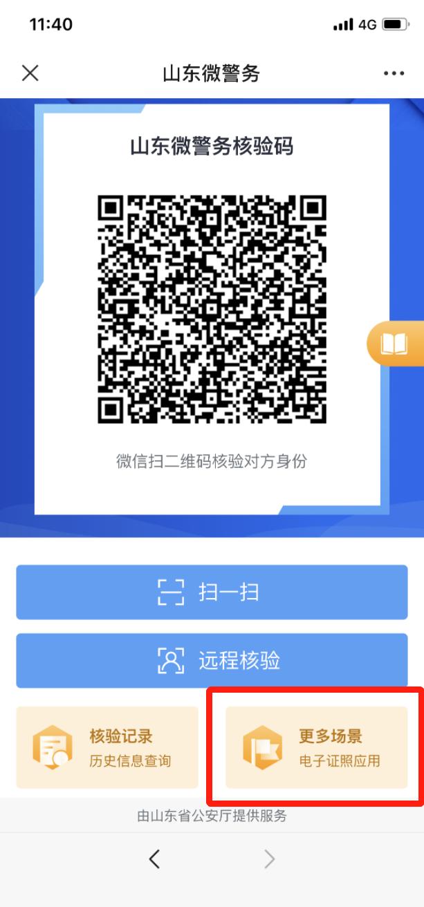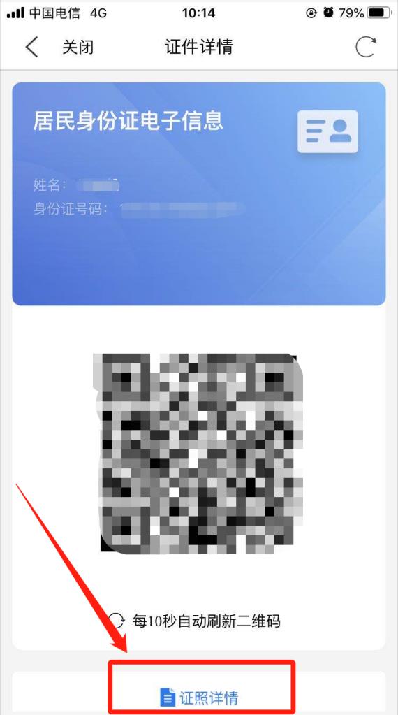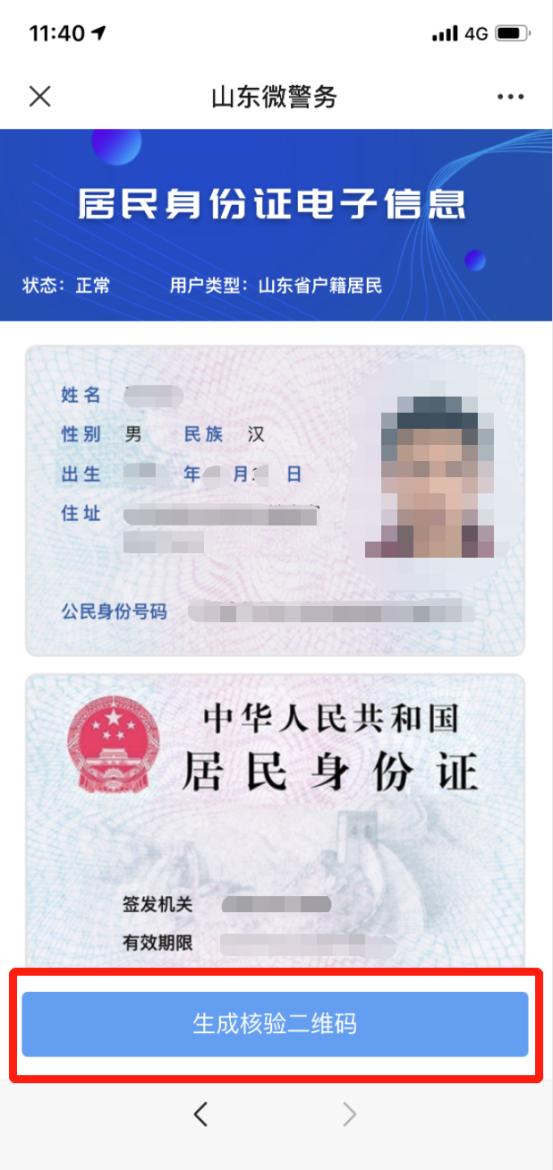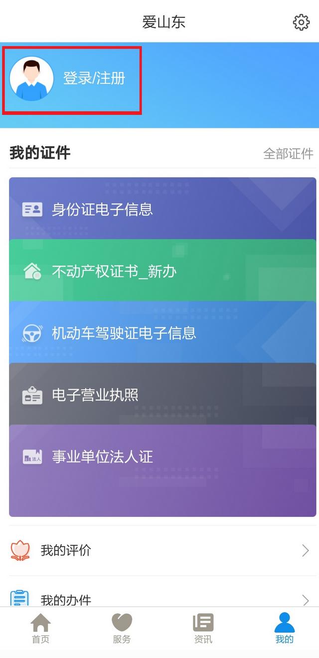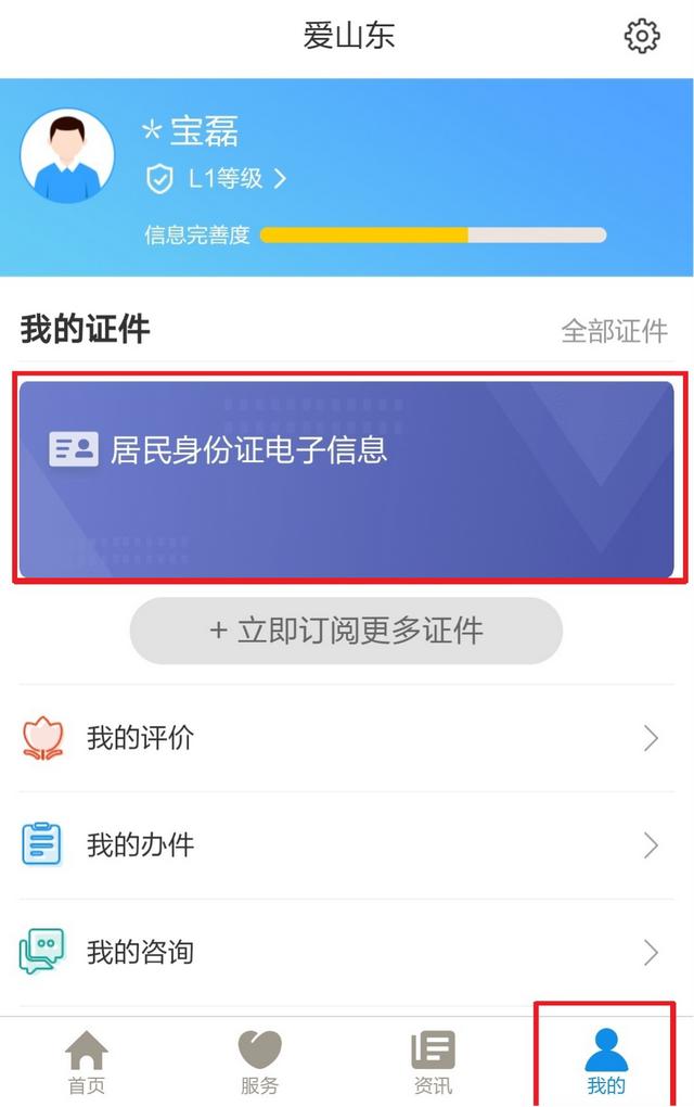 注册完成后,登陆“爱山东”APP,点击“我的”,在“我的证件”中找到“身份证电子信息”,通过人脸比对身份验证后,即可显示身份证电子信息二维码,工作人员通过扫码枪扫描二维码即可在业务办理系统显示身份证电子信息,点击证照详情可在手机端显示身份证电子信息。
