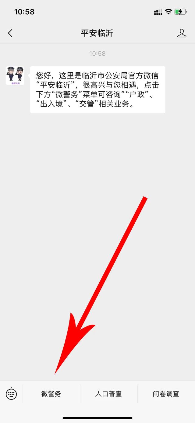 用户通过微信搜索按钮输入“平安临沂”,点击进入微信公众号后关注微信公众号。