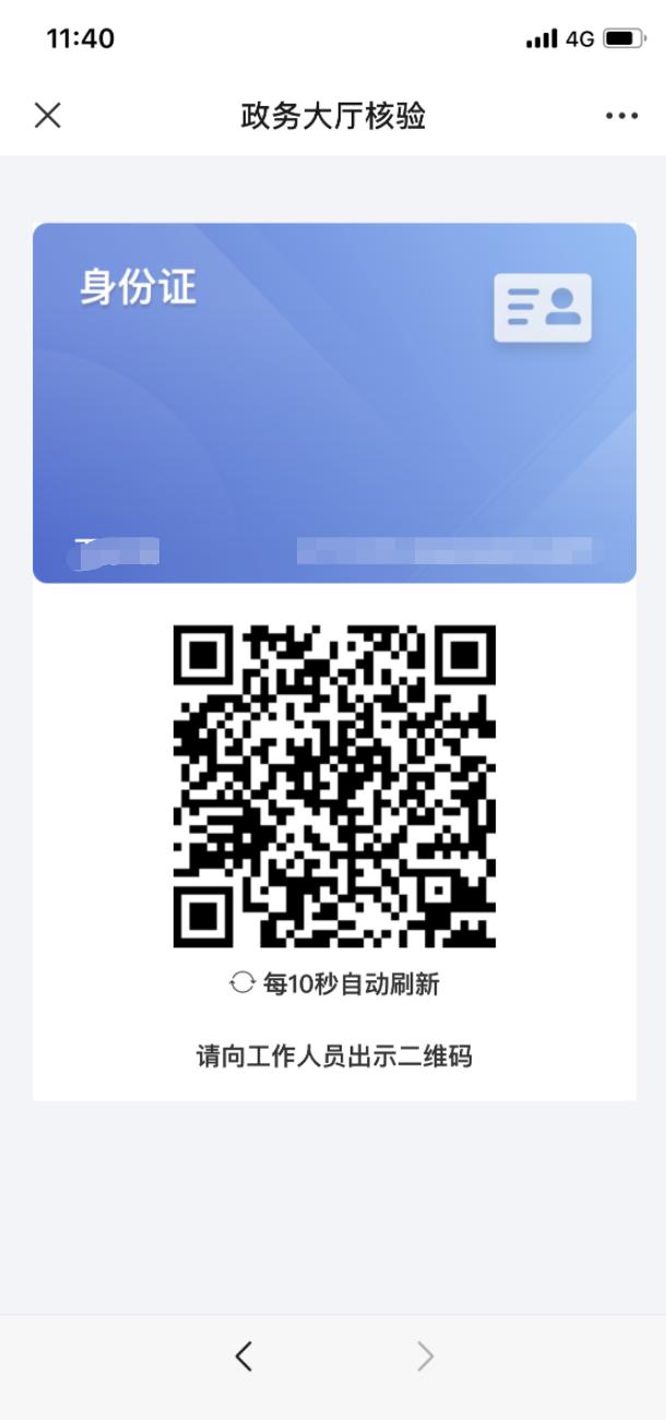 实名认证核验通过后,即可显示电子身份信息,点击生成核验二维码,对方可通过微信扫二维码核验身份。点击“更多场景”后,点击“政务大厅核验”,可以出示政务大厅核验二维码,工作人员通过扫码枪扫描二维码即可在业务办理系统显示身份证电子信息。
