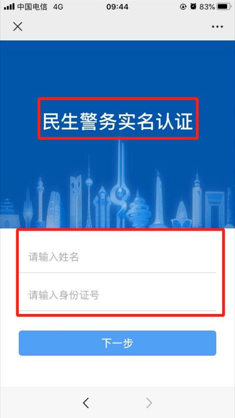 关注后进入公众号首页,点击左下角的“微警务”进入服务台,点击“身份证信息”,输入手机号和验证码进行注册登录,然后输入姓名和身份证进行实名认证,认证时需要进行人脸核验(核验时屏幕闪烁为正常现象)。