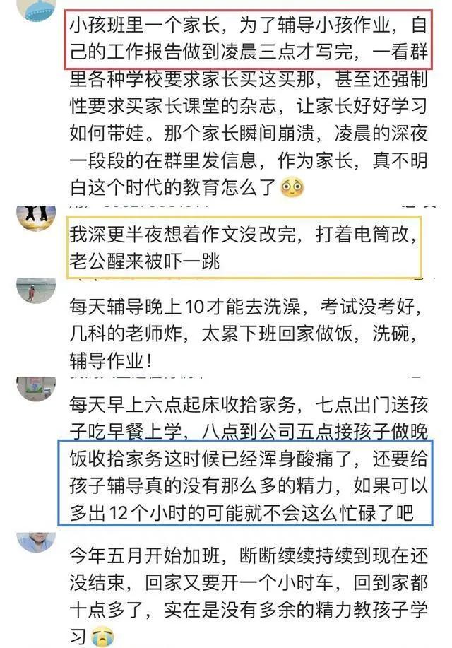 “本来上班的压力就很大,还得盯着老师又发了什么通知。晚一点回复,就会被老师点名,每天下了班还要看着孩子做作业。有时候顾不过来,就被说不关心小孩,是挺委屈的。”