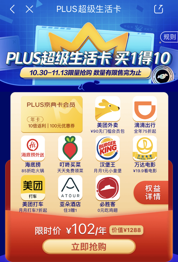 这几年一直在搞各种联合会员的京东,今年双11期间开售的“买1得多”会员,做的是生活类主题:PLUS超级生活卡,买1得10(美团外卖、滴滴出行、叮咚买菜、美团打车、海底捞等),售价为102元/年。此外,京东还与各种不同类型的平台俩俩搭配,形成多种选项,用户可根据自身需求来选择联合会员。