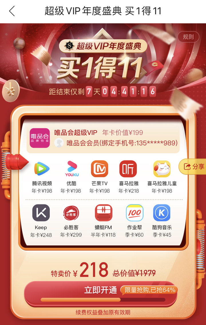就在几天前,唯品会推出买1得11的联合卡,218元/年解锁腾讯视频、优酷、芒果TV、喜马拉雅、喜马拉雅儿童、必胜客、Keep、蜻蜓FM、作业帮、酷狗音乐等11个平台的付费会员权益。