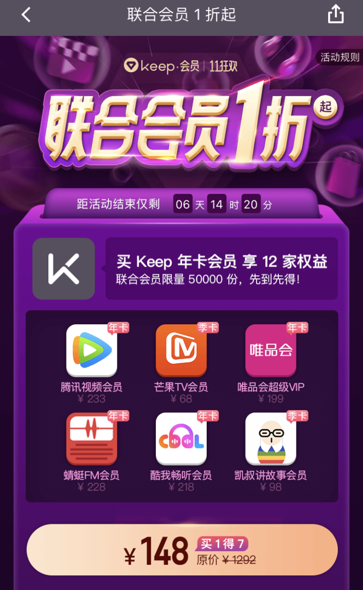 就连网络健身平台Keep今年也做了联合会员的双11促销:买1得7。