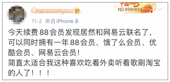 而阿里的88VIP,可以说是将联合会员带到了新高度。2018年8月8日,阿里巴巴集团揭晓88VIP全员会员计划,涵盖旗下所有核心服务,并联合平台上的国内外大牌提供一系列复合权益。今年8月,权益升级扩容。购物的天猫超市,外卖的饿了么,追剧的优酷,听歌的网易云音乐(或虾米),以及买电影票可用的淘票票等,88元/年的会员,光是这几项权益,已让许多网友直呼“划算”。