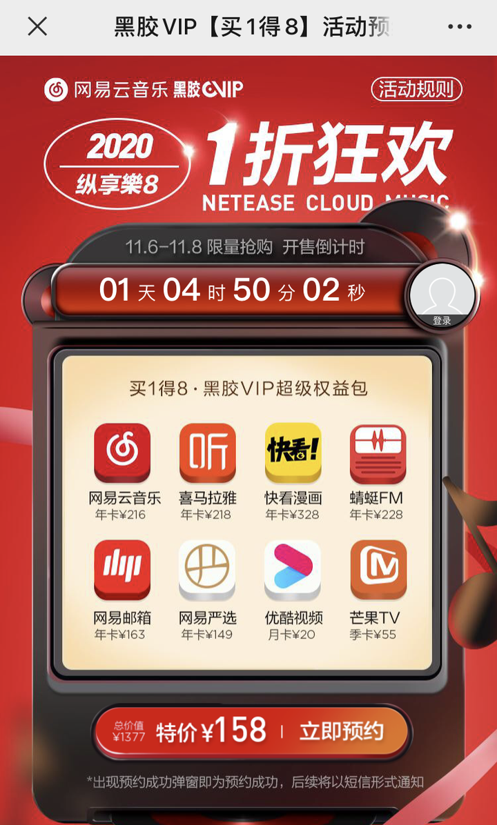 昨晚,朋友圈里又有人友情“广而告之”:网易云音乐黑胶VIP 11月6日开售买1得8的联合会员,内含优酷、芒果TV、网易严选、喜马拉雅等权益,158元/年。