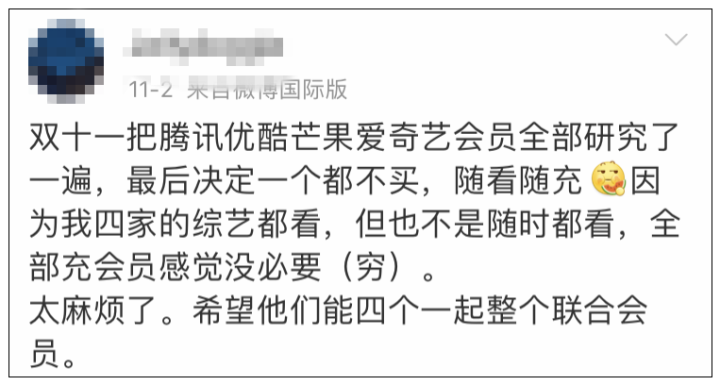 还有不少网友在等优酷、爱奇艺、腾讯视频和芒果TV出个联合会员(愿望是美好的……)。