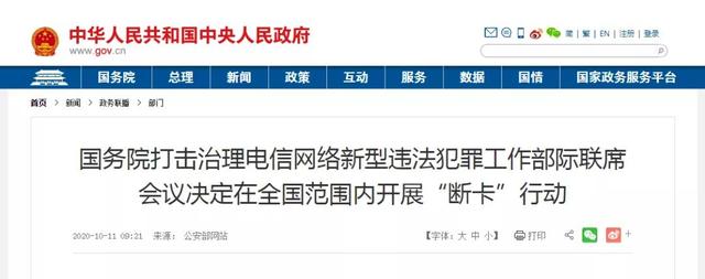10月10日,全国召开以打击、治理、惩戒非法开办贩卖手机卡、银行卡等“两卡”违法犯罪团伙为主要内容的“断卡”行动部署会。