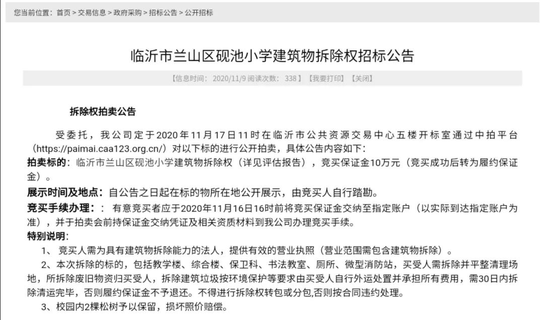 11月9日,临沂市兰山区砚池小学建筑物拆除权招标公告发布。