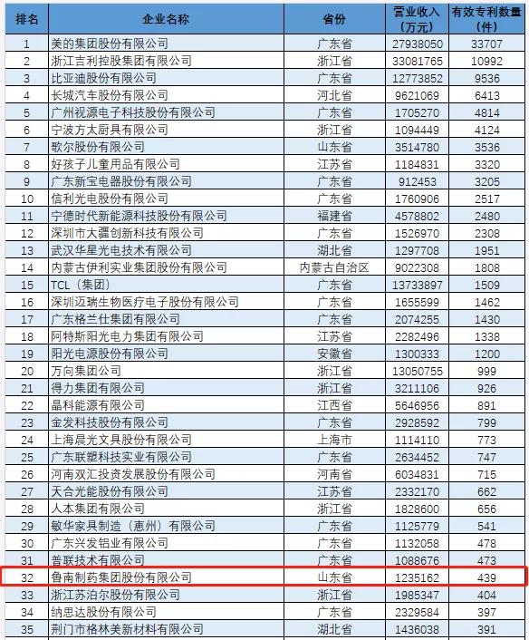 鲁南制药集团凭借439件有效专利数量位居国内医药企业第一位,山东省制造业民营企业第二位,全国榜单第三十二位。