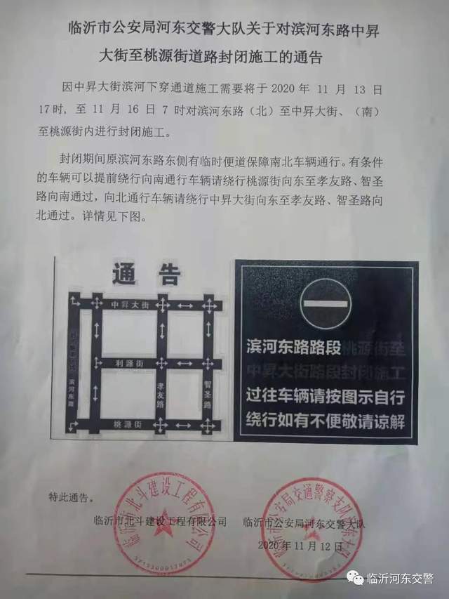 因中昇大街滨河下穿通道施工需要将于2020年11月13日17时至11月16日7时对滨河东路(北)至中昇大街、(南)至桃源街内进行封闭施工。