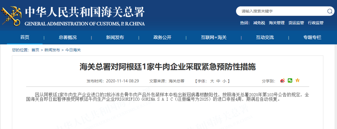 海关总署暂停阿根廷1家肉企进口申报