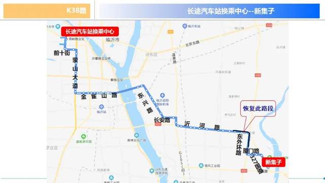 因东外环与沂河路交汇路段施工完毕,公交车辆可以通行,即日起K38路公交线路恢复此路段原线路运营。