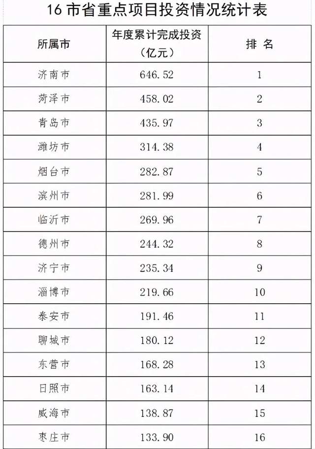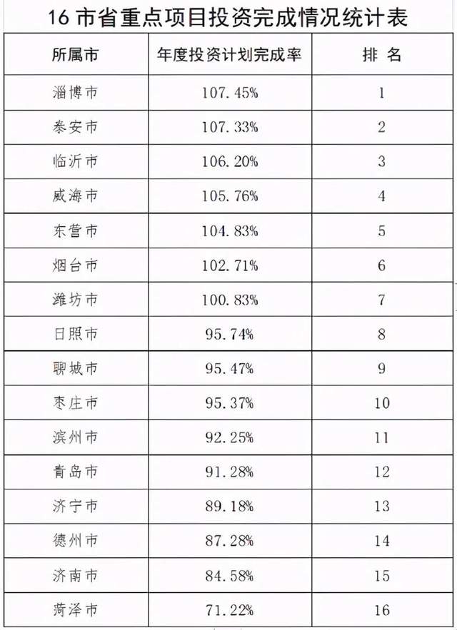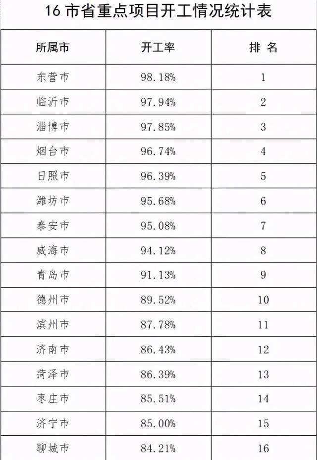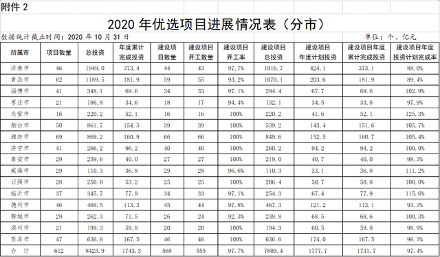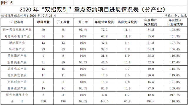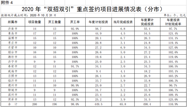 “双招双引”重点签约项目:200个省“双招双引”重点签约项目已经开工196个,当月完成投资65.84亿元,累计完成投资498.45亿元,超年度投资计划10.89个百分点。分市看,16市完成年度计划均超时间进度,青岛、淄博、枣庄、东营、烟台、潍坊、济宁、泰安、威海、日照、临沂、聊城、滨州、菏泽等14市提前完成全年投资计划,青岛、淄博、枣庄、东营、烟台、潍坊、济宁、威海、日照、临沂、聊城、滨州等12市开工率100%。