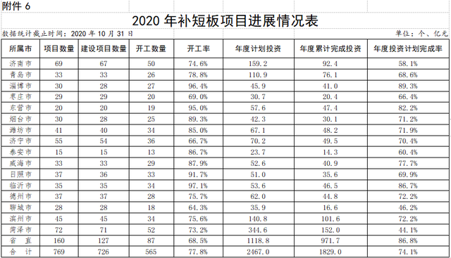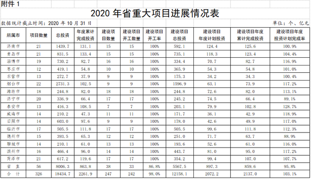 省重大项目:326个省重大项目中,计划年内开工的247个建设类项目已经开工242个,当月完成投资254.82亿元,累计完成投资2136.97亿元,超年度投资计划3.13个百分点;79个准备类项目已经开工15个,累计完成投资124.87亿元。分市看,16市完成年度计划均超时间进度,济南、青岛、淄博、枣庄、东营、烟台、潍坊、泰安、威海、日照、临沂、聊城、滨州、菏泽等14市提前完成全年投资计划。