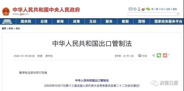 自2019年12月以来,历经三次审议,十三届全国人大常委会第二十二次会议17日表决通过了出口管制法。出口管制法包括五章49条,从管制政策、管制清单和管制措施,监督管理,法律责任等方面进行了详细规定,将于2020年12月1日起施行。