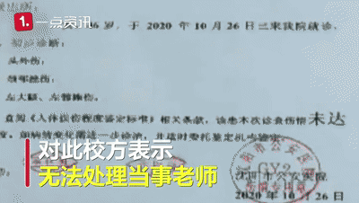 随后,警方介入调查。警方表示方大姐只需签字就可拘留殴打者,但方大姐表示只想让班主任夫妇道歉,“我当时没签字,就是想留点余地。”但方大姐等了一个多月也没有等到道歉,于是去学校找校领导寻求帮助。