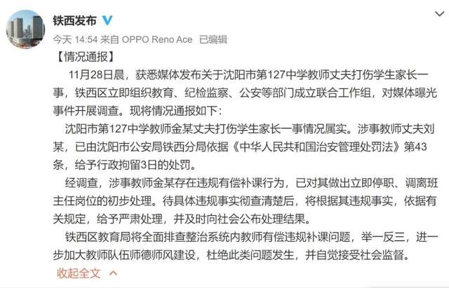 11月28日,沈阳市铁西区委宣传部发布通报称,给予涉事教师丈夫刘某行政拘留3日的处罚。经调查,涉事教师金某存在违规有偿补课行为,已对其做出立即停职,调离班主任岗位的初步处理。