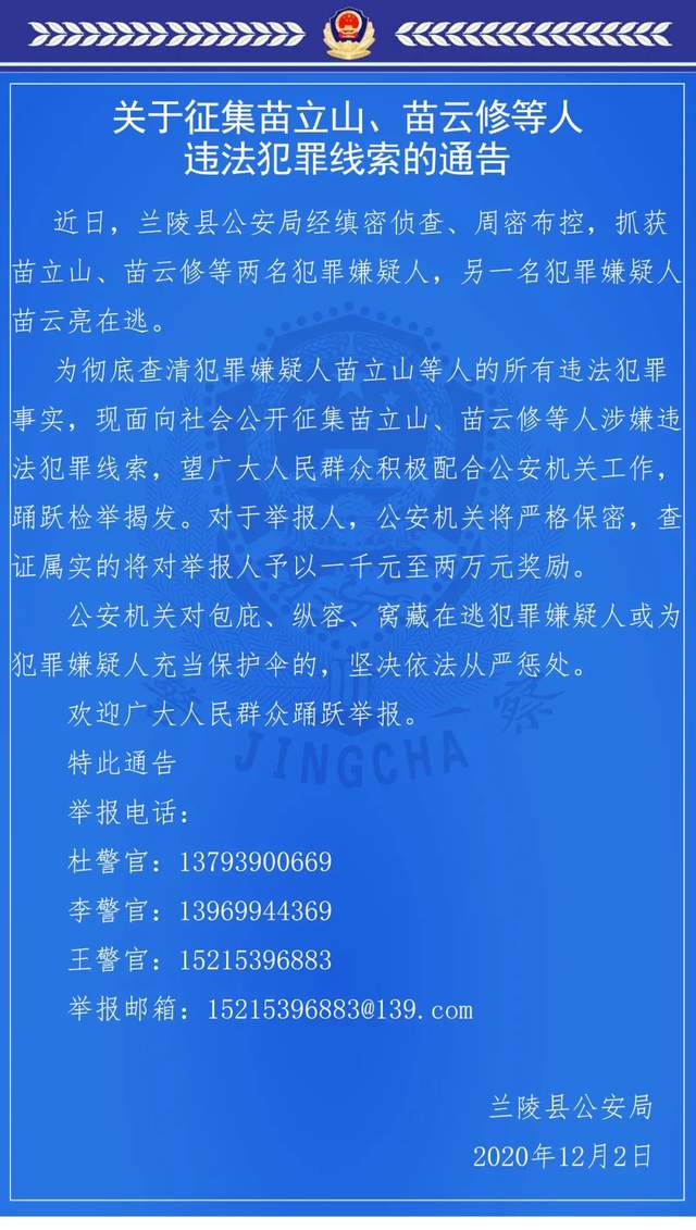 奖金最高2万!临沂警方征集苗立山、苗云修等人违法犯罪线索