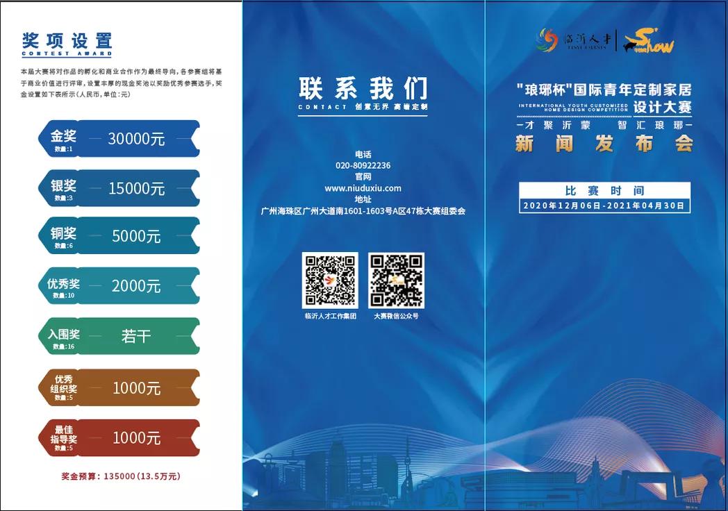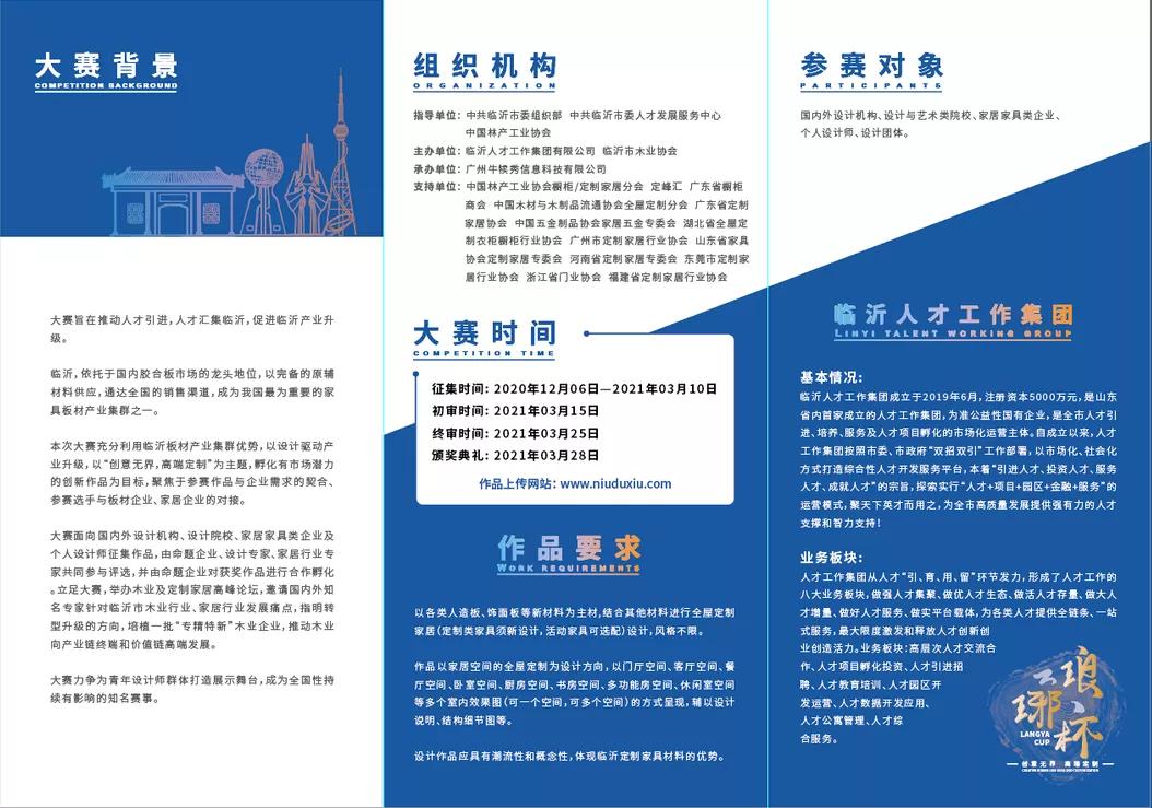 本次大赛旨在推动人才引进、人才汇聚,促进临沂木业产业转型升级,以“创意无界,高端定制”为主题,2020年12月6日—2021年3月10日,公开面向国内外设计机构、设计艺术类院校、家居家具类企业、独立设计师征集参赛作品。参赛作品需具有潮流性和概念性,体现临沂定制家居原材料优势,以各类人造板、饰面板等新材料为主材,结合其他材料进行全屋定制家居设计,风格不限。