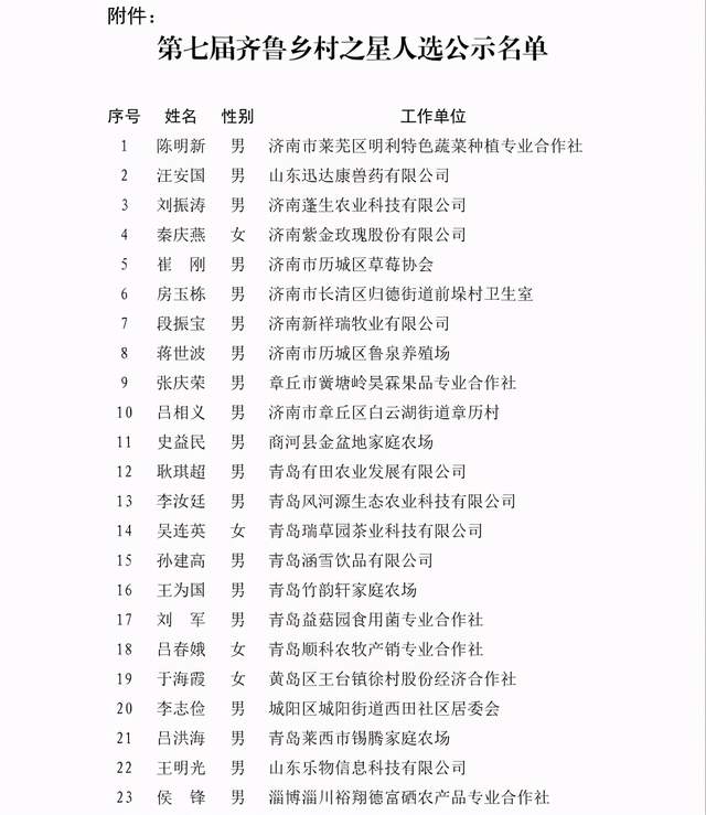 根据《齐鲁乡村之星选拔管理办法》(鲁政办发﹝2015﹞135号)规定,经自下而上逐级推荐并组织评审,遴选出150名第七届齐鲁乡村之星人选。为进一步增强评选工作的透明度,广泛接受社会监督,决定对第七届齐鲁乡村之星人选进行公示和考察。现将有关事项通知如下: