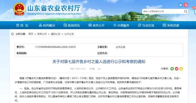 一、公示。在山东省农业农村厅网站和各推荐单位、人选所在单位公示,公示期为5个工作日。山东省农业农村厅网站公示期为12月3日至12月9日。推荐单位、人选所在单位的公示工作应于12月11日前完成,可以采取在显要位置张贴公示公告,单位网站、内部局域网同时公示等多种易于周知的方式公示。公示期间,如对人选相关情况有异议,可以直接向单位人事部门或上级主管部门反映,也可向齐鲁乡村之星选拔管理工作办公室反映,反映时须署真实姓名及联系方式。