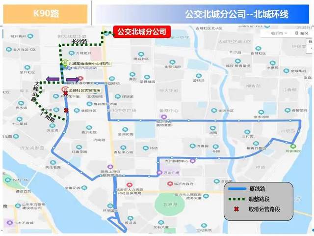 K90路原由北城车站换乘中心始发环线运营,线路主要途经马陵山路、北京路、上海路、沂蒙路、祊河路、沂蒙路、上海路、孝河路、天津路、兰亭路、黄白河路、广州路、沂蒙路、武汉路、马陵山路,调整后线路将取消马陵山路(广州路—武汉路)段的运营,调整至南昌路、沂蒙路、长沙路、马陵山路、武汉路、文峰山路、广州路运营。调整后线路由公交北城分公司始发环线运营,线路主要途经南昌路、沂蒙路、长沙路、马陵山路、武汉路、文峰山路、广州路、马陵山路、北京路、上海路、沂蒙路、祊河路、沂蒙路、上海路、孝河路、天津路、兰亭路、黄白河路、广州路、沂蒙路、武汉路、马陵山路、长沙路、沂蒙路、南昌路,取消停靠站点2处:金颐社区、金颐社区农贸市场,增加停靠站点8处:公交北城分公司、后明坡、马陵山路东、临沂南坊小学、曦园、爱伦坡南、阜丰•大成郡东、金升社区A区,对于取消停靠的公交站点乘客可至就近站点选乘其它公交线路乘车出行,给您带来的不便敬请谅解。