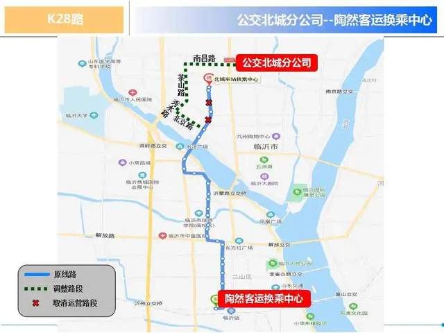 K28路原由北城车站换乘中心运行至陶然客运换乘中心,线路主要途经陶然路、八一路、解放路、八腊庙街、前十街、马陵山路,调整后线路将取消马陵山路(北京路—北城车站换乘中心)段的运营,调整至北京路、秀水路、茶山路、南昌路运营。调整后线路由公交北城分公司运行至陶然客运换乘中心,线路主要途经陶然路、八一路、解放路、八腊庙街、前十街、马陵山路、北京路、秀水路、茶山路、南昌路,取消停靠站点5处:北城汽车站换乘中心、金颐社区农贸市场、金颐社区、爱伦坡、城市主人,增加停靠站点13处:公交北城分公司、博观新城、临沂第九中学、文峰山路东、茶山路东、城开首府、金升小区南区西、怡都花园、金城溪园、秀水雅苑西、秀水雅苑、润园、慧园•沂龙湾,对于取消停靠的公交站点乘客可至就近站点选乘其它公交线路乘车出行,给您带来的不便敬请谅解。