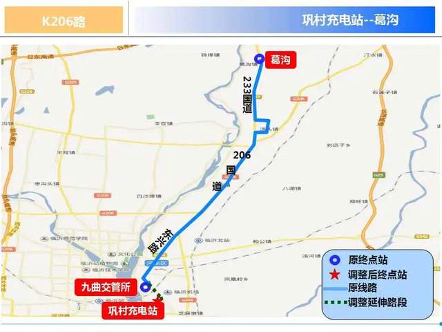 K206路原由九曲交管所运行至葛沟,线路主要途经金雀山东路、东兴路、206国道、汤头、233国道,调整后将取消金雀山东路(九曲交管所—东兴路)段的运营,调整至东兴路运营。调整后线路由巩村充电站运行至葛沟,线路主要途经东兴路、206国道、汤头、233国道,取消停靠公交站点2处:九曲交管所、河东汽车站,增加停靠公交站点5处:巩村充电站、沂河一英里、飞机场路口、伦达国贸城、红太阳家具市场,对于取消停靠的公交站点乘客可至就近站点选乘其它公交线路乘车出行,给您带来的不便敬请谅解。