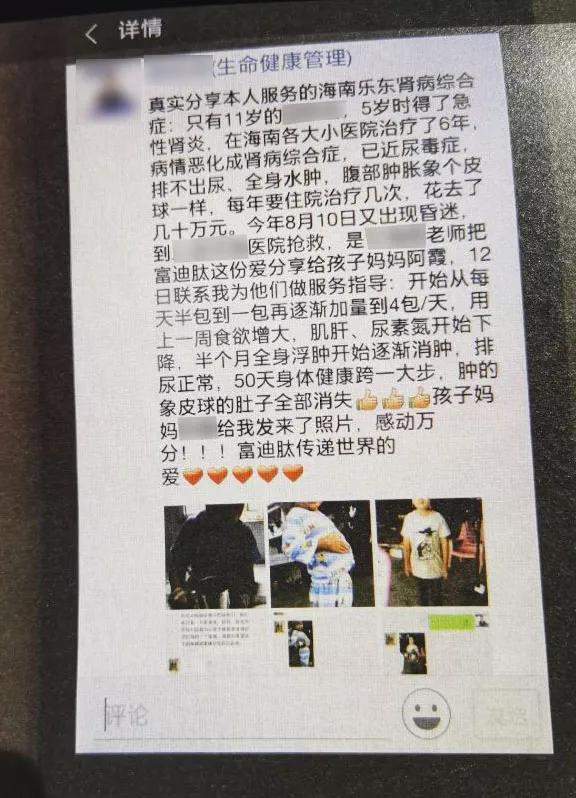 对此,海口市市场监督管理局认为,申请人在其微信朋友圈宣传富迪小分子肽产品,该产品品名为小分子肽固体饮料,配料表是大豆肽粉(非转基因大豆)、菊粉,产品类型为固体饮料,并非药品,不具有疾病治疗功能。而申请人通过在其微信朋友圈宣传该产品能够治疗肾病综合症、肺气肿等案例,以此来宣传该产品具有疾病治疗功能。且申请人认为富迪小分子肽是符合国家食药监局相关规定的保健食品,没有对人体有毒有害的物质,即其已经承认富迪小分子肽根本不是药品。