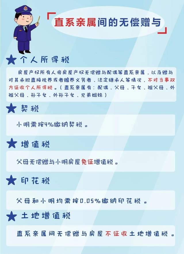 个人所得税:按照《财政部国家税务总局关于个人无偿受赠房屋有关个人所得税问题的通知》(财税〔2009〕78号)第一条规定,符合以下情形的,对当事双方不征收个人所得税: