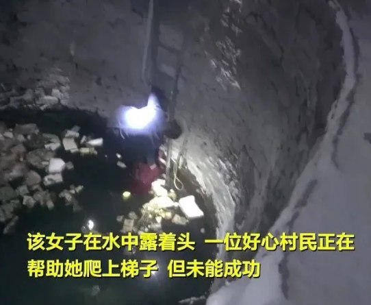 被困女子身体大部分都在水中,只有头露出水面,一位好心村民想帮她爬上梯子,但未能成功。