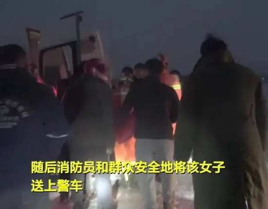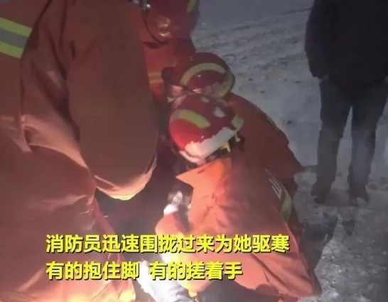 救上来后,消防员迅速围拢起来为她驱寒,有的抱住脚、有的搓着手,还有人为她披上羽绒服,随后安全地将该女子送上警车。