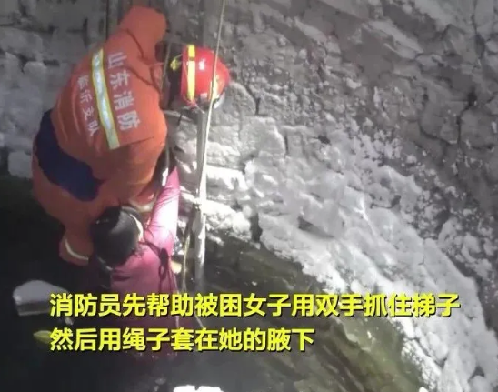 他先帮助被困女子用双手抓住梯子,然后小心翼翼地用绳子套在她的腋下,众人合力将她拽上井口。