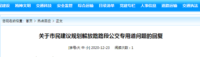 近期,有市民建议规划解放路路段公交专用道。临沂市交通运输局客管办与公交集团公司及时组织相关人员进行调查落实,现回复如下:
