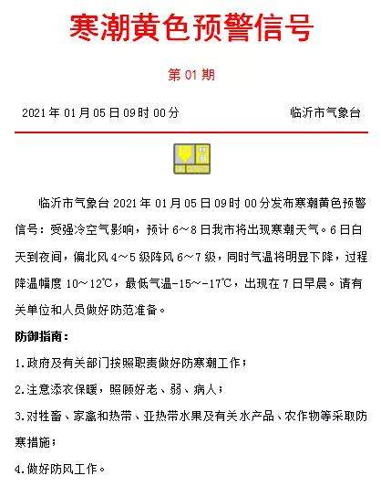 临沂市气象台 2021 年 1 月 5 日 9:00 发布寒潮黄色预警信号,受强冷空气影响,预计 6-8 日我市将出现寒潮天气,6 日白天到夜间偏北风 4-5 级,阵风 6-7 级,同时气温将明显下降,过程降温幅度 10-12°C,最低气温零下15- 零下 17°C,出现在7日早晨。此次低温天气持续时间长,温度低,为确保全市教育系统安全度过严寒天气,现就有 关事项通知如下: