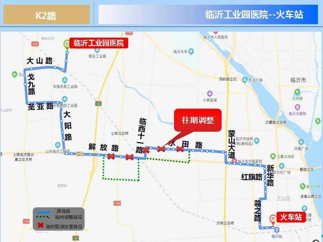 因解放路(临西十二路至俄黄路路段)道路封闭施工,公交车辆无法通行,自2021年1月15日起公交集团K2路公交线路临时调整,具体如下:K2路线路主要途经陶然路、羲之路、新华路、红旗路、通达路、解放路、水田路。临时调整后线路将临时取消解放路(临西十二路至俄黄路路段),临时调整至临西十二路(解放路至启阳路路段)、启阳路(临西十二路至俄黄路路段)、俄黄路(启阳路至解放路路段)运营,临时取消停靠公交站点3处:古城中心街、华森水泥厂、西郊医院,待道路施工完毕后将恢复该路段的公交线路原线路运营,由此带来的不便敬请谅解。