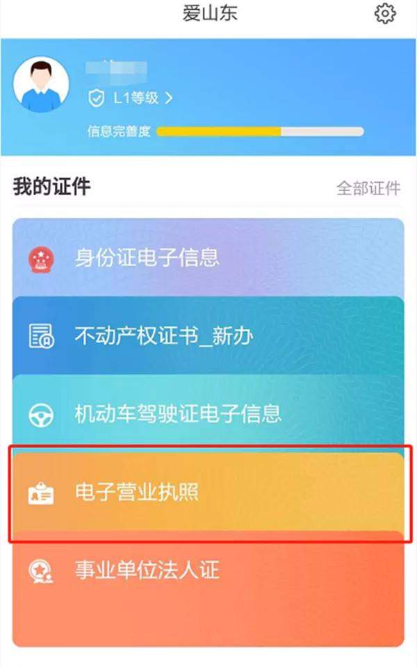 注册完成后,登陆“爱山东”APP,点击“我的”,在“我的证件”中找到“电子营业执照”,点击进入“电子营业执照”模块。