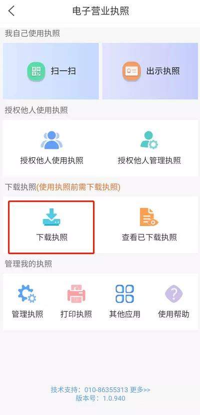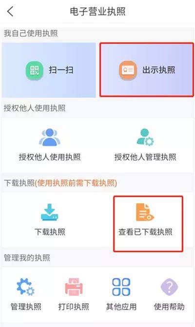 点击“查看已下载执照”或者“出示执照”,输入执照密码,可以查看证照相关信息及图片。也可以在电子营业执照模块进行执照管理和打印等。
