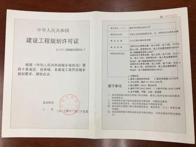 临沂市自然资源和规划局提供的后园馨园E区的土地规划许可证,其中明确2#、3#、5#为酒店式公寓商业楼。新华社记者杨文 摄