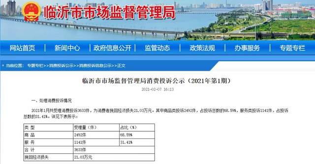 临沂市市场监管局消费投诉公示(2021年第1期)