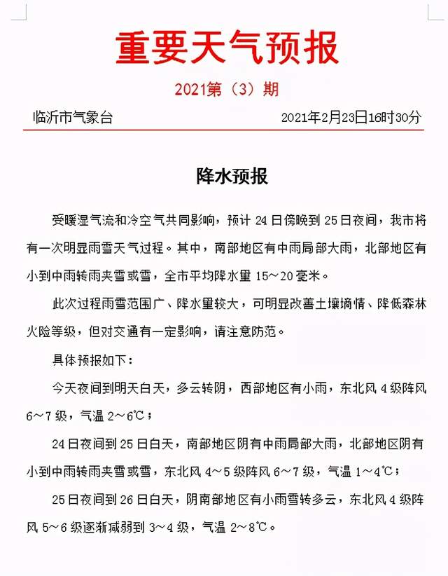 24日夜间到25日白天,南部地区阴有中雨局部大雨,北部地区阴有小到中雨转雨夹雪或雪,东北风4~5级阵风6~7级,气温1~4℃;